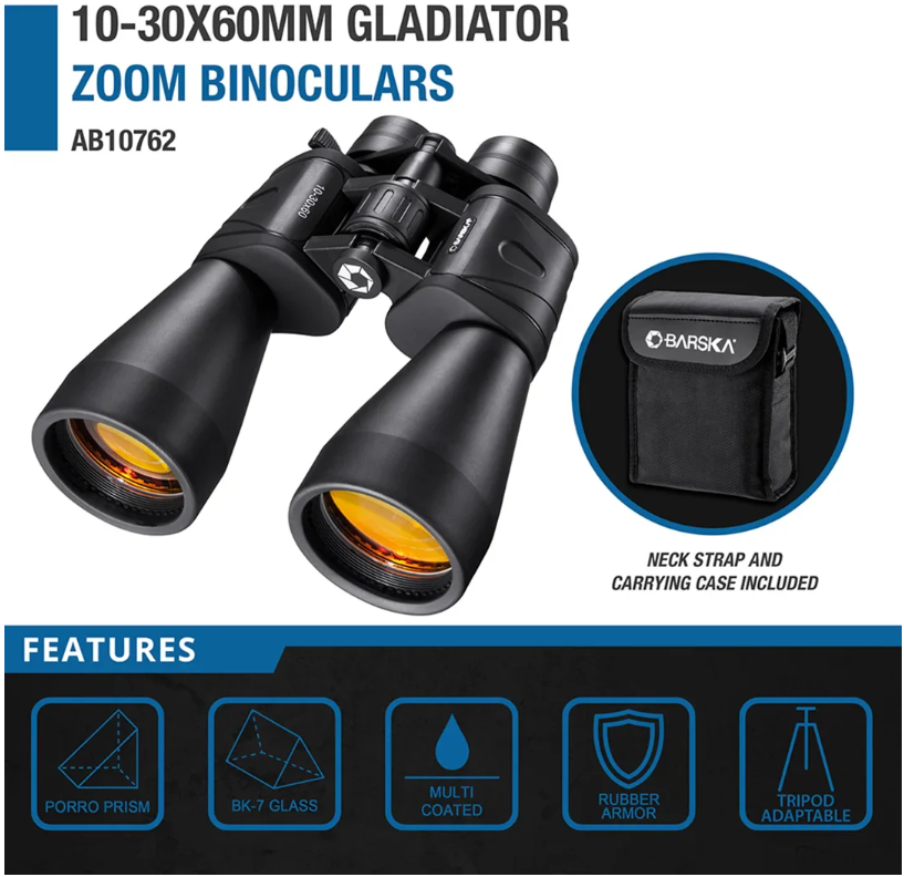 Perfect for both terrestrial and astronomical applications, the Barska 10-30x60mm Gladiator Zoom Binoculars bring distant objects closer with precision. Whether you’re an amateur astronomer or an outdoor enthusiast, these binoculars deliver unmatched performance and reliability.
